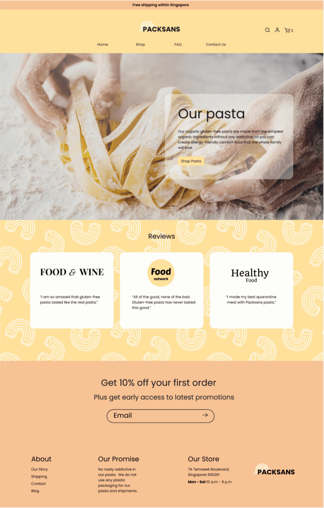 This was one of my assignments during my UI/UX diploma where I was required to design the UI for a website. The objective was to develop a unique brand identity, and I opted to create a website for a zero-waste pasta shop, an e-commerce site where customers can buy just the right amount of pasta they need, reducing waste and unnecessary purchases. To infuse the brand with personality, I chose a vibrant yellow colour as the primary colour, conveying optimism, joy, and happiness. It was a fun and fulfilling challenge!